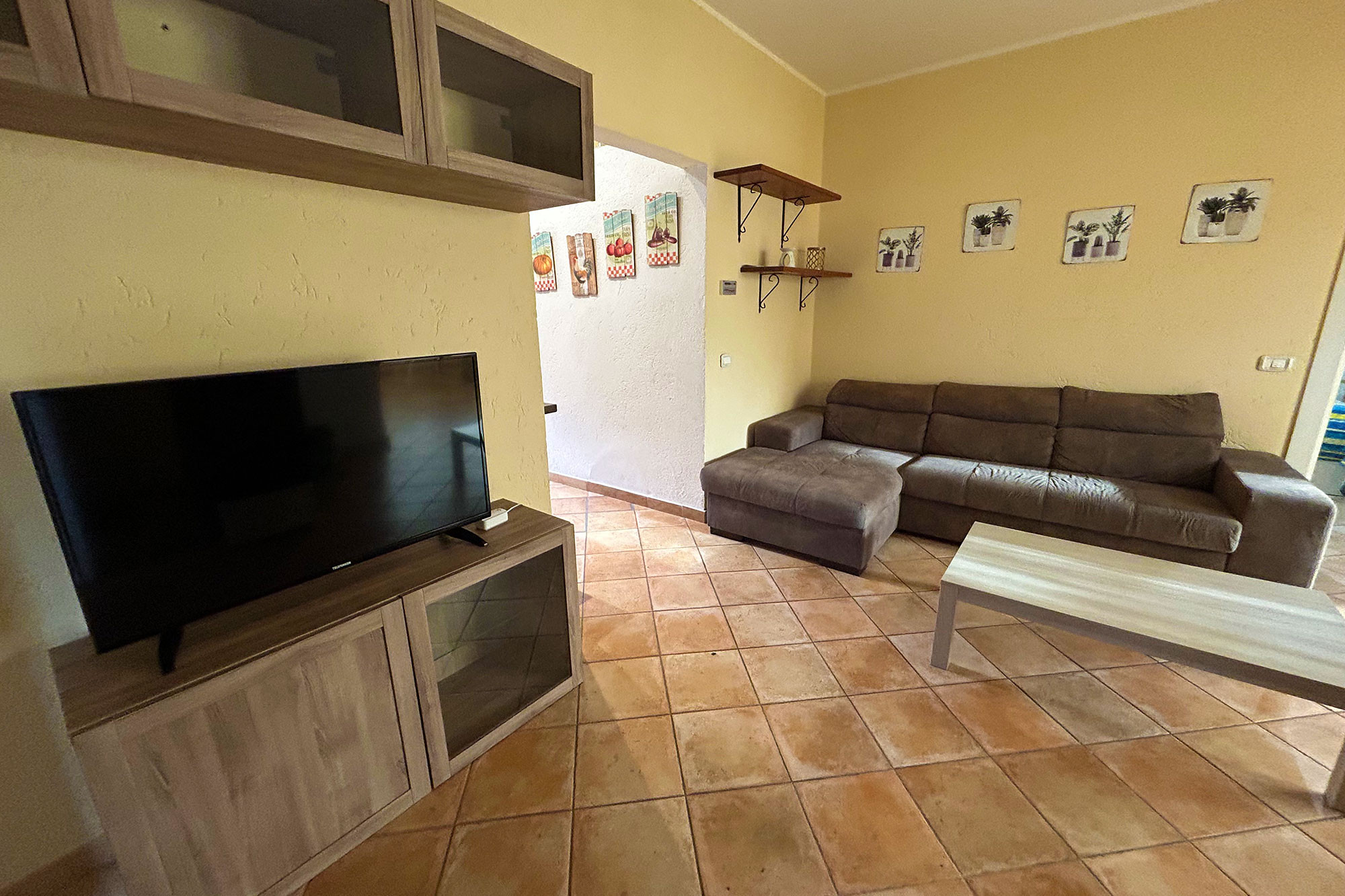 De là, vous accédez au salon, un espace chaleureux et confortable avec canapés et télévision, idéal pour se détendre après une journée à la plage.