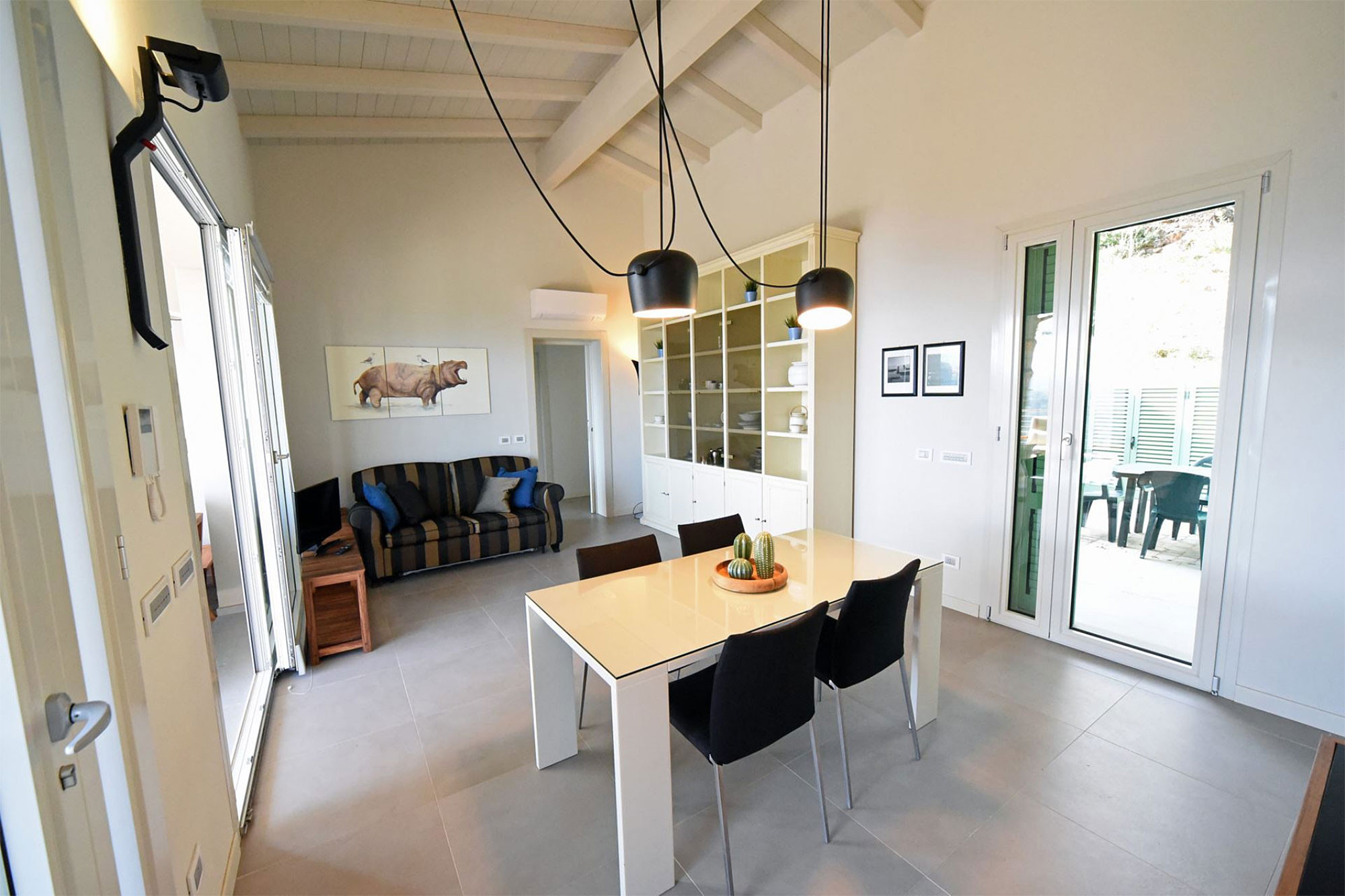 La villa est meublée avec grand soin et présente du mobilier de grandes maisons de design italiennes (Zanotta, Molteni, lampes Le Corbusier, Munari, etc.), tout en étant parfaitement adaptée aux familles. Sur demande et sans supplément, un lit d’enfant, une chaise haute, une table basse avec trois chaises, des verres et des couverts pour enfants sont disponibles.