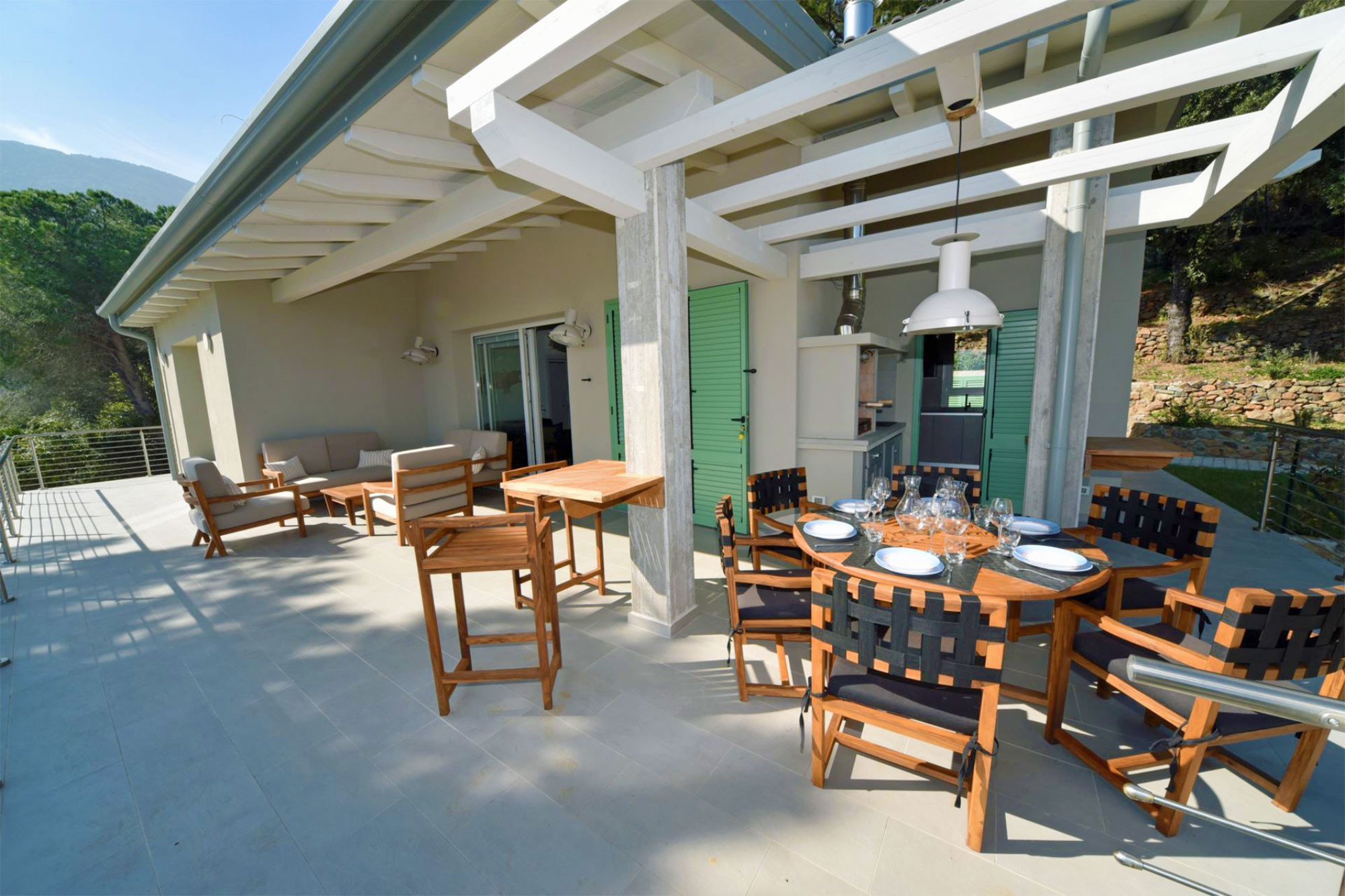 Le point fort de la villa est sa grande terrasse avec vue sur la mer. D'un côté, un coin salon avec canapés et fauteuils est aménagé, et de l'autre, une table avec chaises, un barbecue et un évier extérieur permettent de dîner en plein air tout en profitant de la splendide vue.