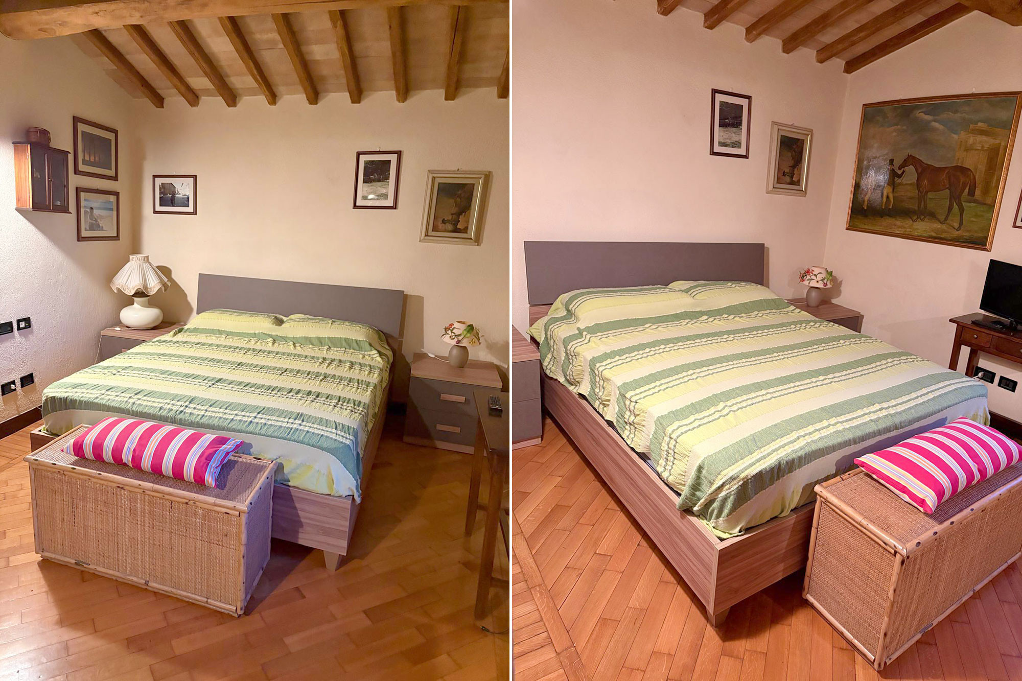 La première chambre est meublée avec un lit français, la seconde avec deux lits simples et enfin la troisième avec un grand lit double et un autre lit simple sur une mezzanine. Toutes les chambres sont meublées avec des meubles antiques toscans. La salle de bain au premier étage dispose d'un bain à remous pour votre détente.