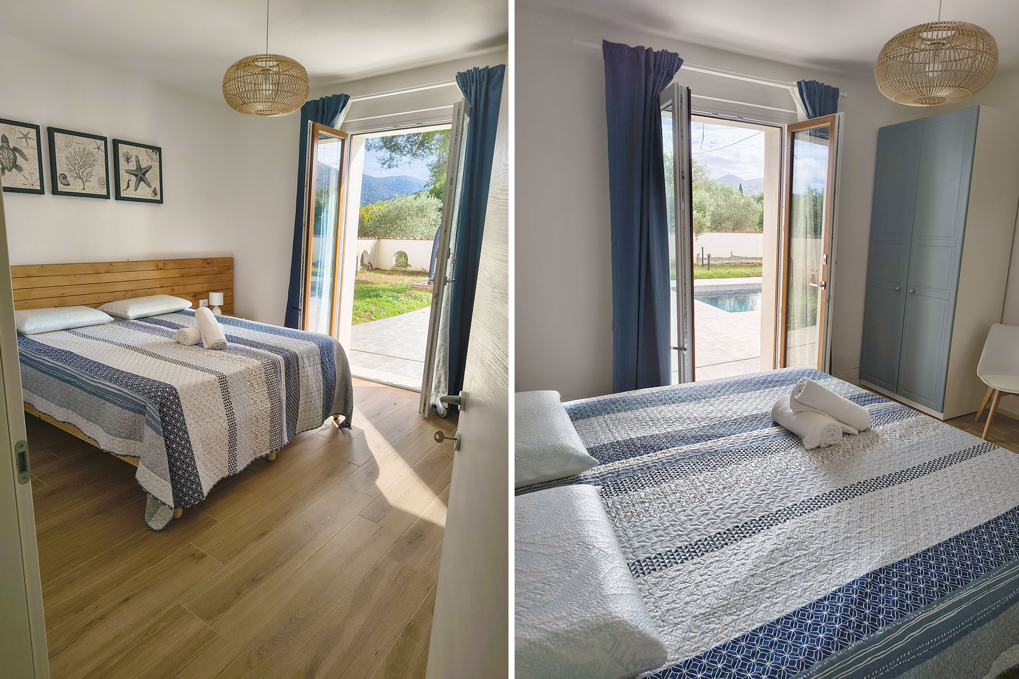 L'une des chambres s'ouvre sur la terrasse donnant sur la piscine.