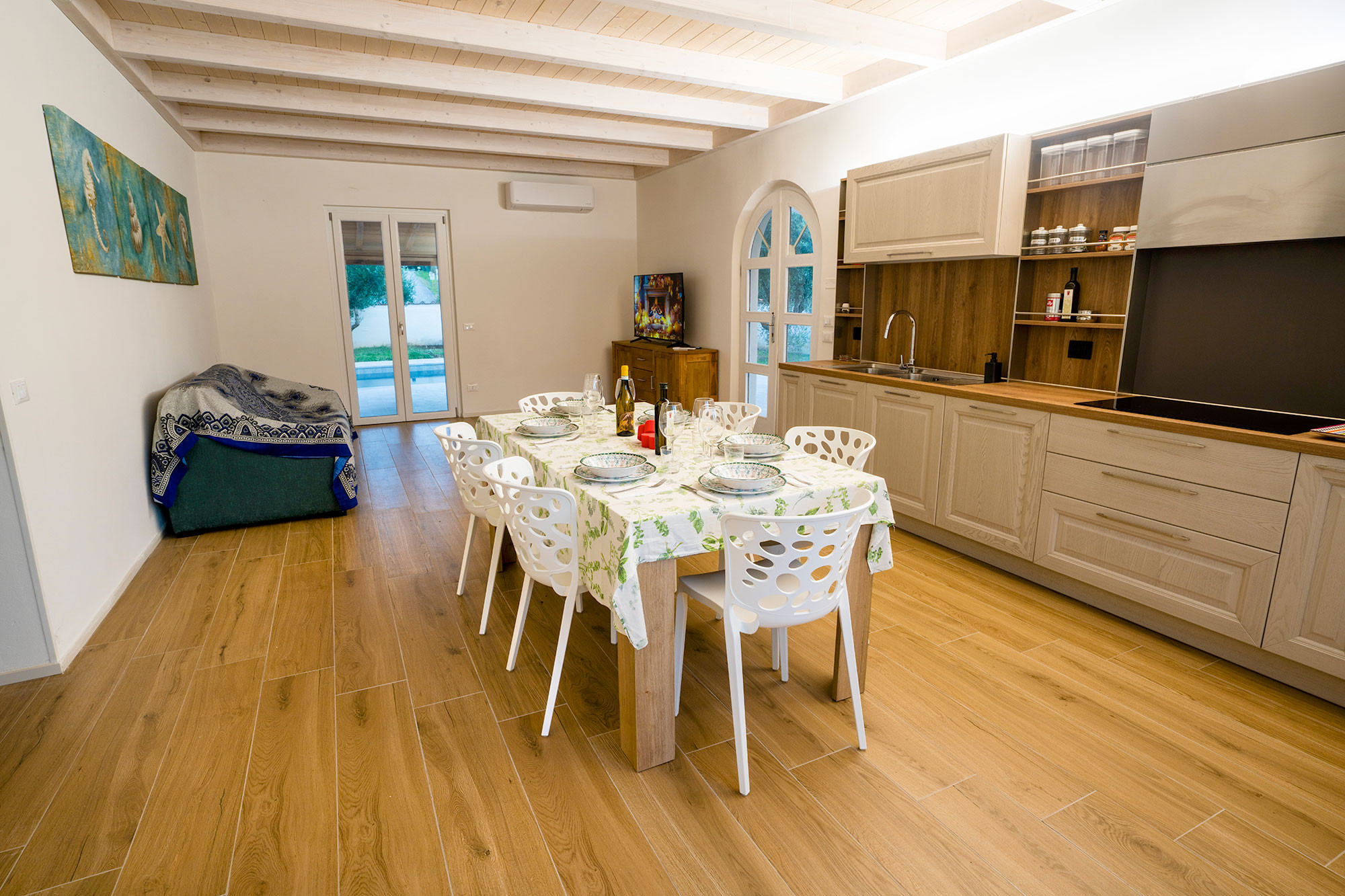 L'entrée de la villa donne directement sur le grand séjour/salle à manger/cuisine, un espace unique de près de 45 m². C'est également là que se trouve le canapé-lit deux places.