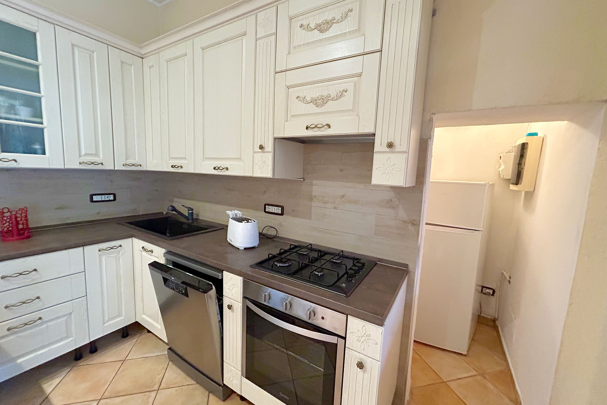 L’ingresso si apre sulla cucina ben attrezzata, dotata di lavastoviglie, forno e tutti gli accessori indispensabili per cucinare in autonomia.
