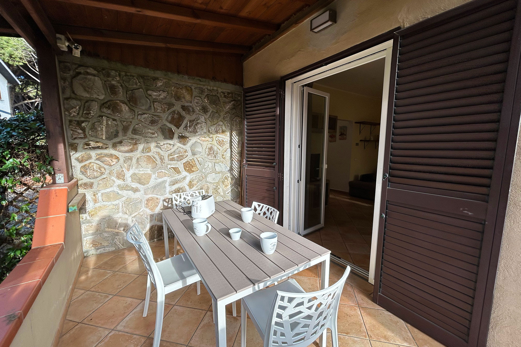 Dalla cucina / soggiorno si accede ad un grande terrazzo coperto con tavolo e sedie per poter mangiare all’aria aperta. Ci si trova anche la lavatrice.
