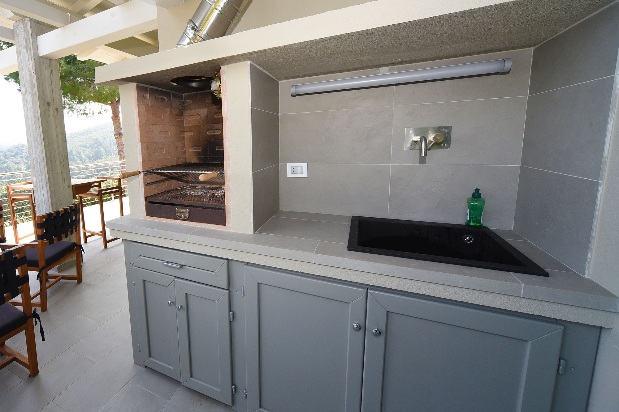 Il punto di forza della Villa è la sua grande terrazza vista mare. Da una parte c’è un angolo salotto con divani e poltrone e dall’altra un tavolo con sedie, un barbecue e lavello esterno per cenare fuori e godersi il panorama.